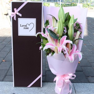 花语:季节匆匆地走过,岁月带来了变化,惟一不变的是我依然爱着你。材料:12朵粉色香水百合,黄莺,勿忘我搭配。包装:粉色雾面纸扇形包装,粉色缎带束扎,精美礼盒包装。附送:免费附送精美贺卡,代写您的祝福。(您下单时可填写留言栏)配送:全国(可配送至全国900多个城市,市区免费配送)备注:由于鲜花包扎各地的花艺师不同,可能在花束的形式和搭配上与图片不完全一致,但我们保证鲜花的主花材品种、新鲜程度、数量、颜色与说明一致,谢谢。 爱着是美丽的