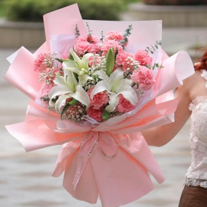花语:在这特殊的日子里,愿你天天快乐,年年好运,一生幸福!材料:19朵粉色康乃馨,4朵白色百合,白色满天星,尤加利点缀包装:粉色包装附送:免费附送精美贺卡,代写您的祝福。(您下单时可填写留言栏)配送:全国(可配送至全国900多个城市,市区免费配送)备注:鲜花产品您至少应提前三小时下订单,我们保证按时送达; 为了能够有充分的时间准备,我们建议您尽早预定。 健康快乐
