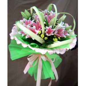 花语:是缘使我们走到了一起!希望我们能一直走下去,从缘起走到缘续,从缘续走到缘定.... 材料:6枝精品粉色香水百合.配绿草包装:剑叶搭配,粉色卷纸豪华艺术圆形包装! 附送:免费附送精美贺卡,代写您的祝福。(您下单时可填写留言栏)配送:全国配送,送货上门备注:粉百合寓意:象征清纯、高雅; 6枝寓意:愿你的一切都顺心如意! 迷人眼神