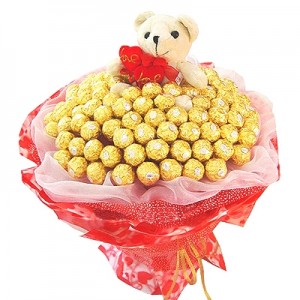 花语:愿我的祝福像阳光那样缠绕着你,真诚地祝愿健康和快乐永远伴随你。材料:费列罗巧克力99枝,可爱米白色小熊一只,一对红色心形装饰。包装:内衬白色软纱,外用红色网纱和红色皱纸多层包装,绑金色花结。附送:免费附送精美贺卡,代写您的祝福。(您下单时可填写留言栏)配送:全国(可配送至全国900多个城市,市区免费配送) 甜蜜